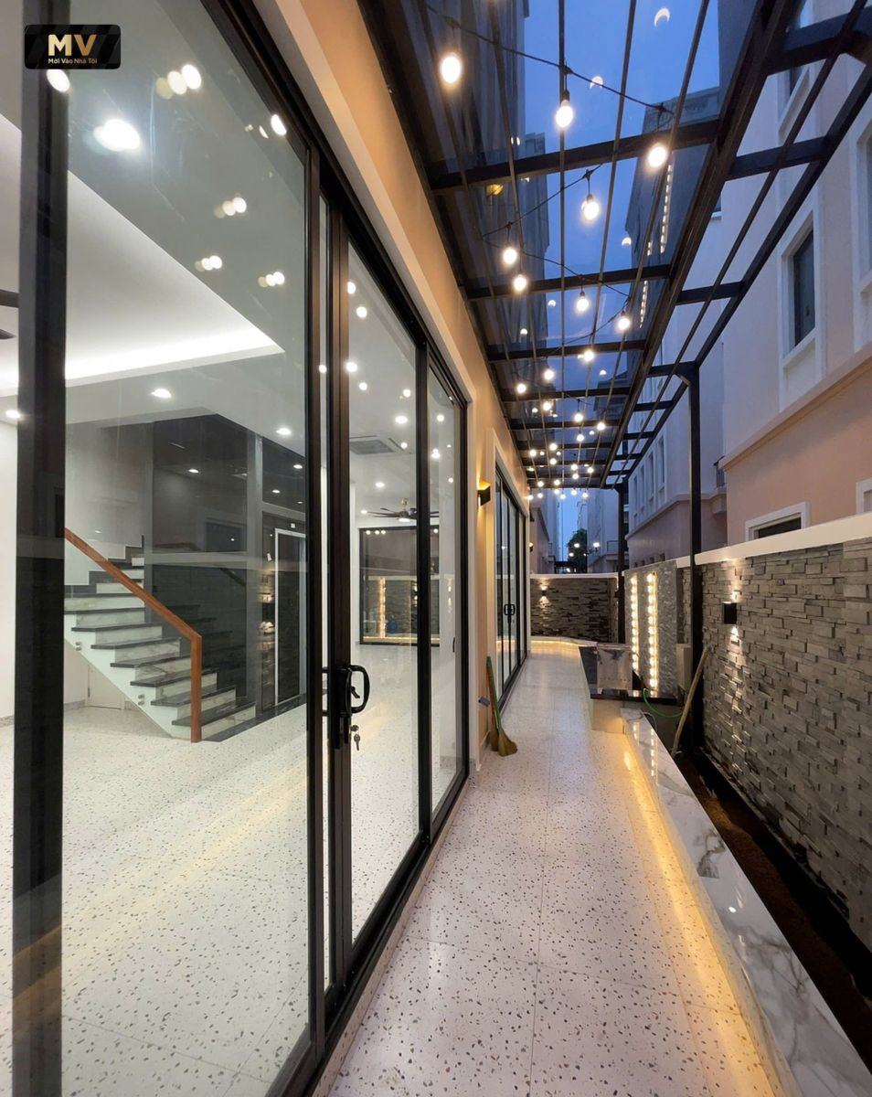 Một trong những điểm hay nhất của công trình là khu sân bên có mái kính. Đây không chỉ là lối đi, mà là một “không gian trải nghiệm”: