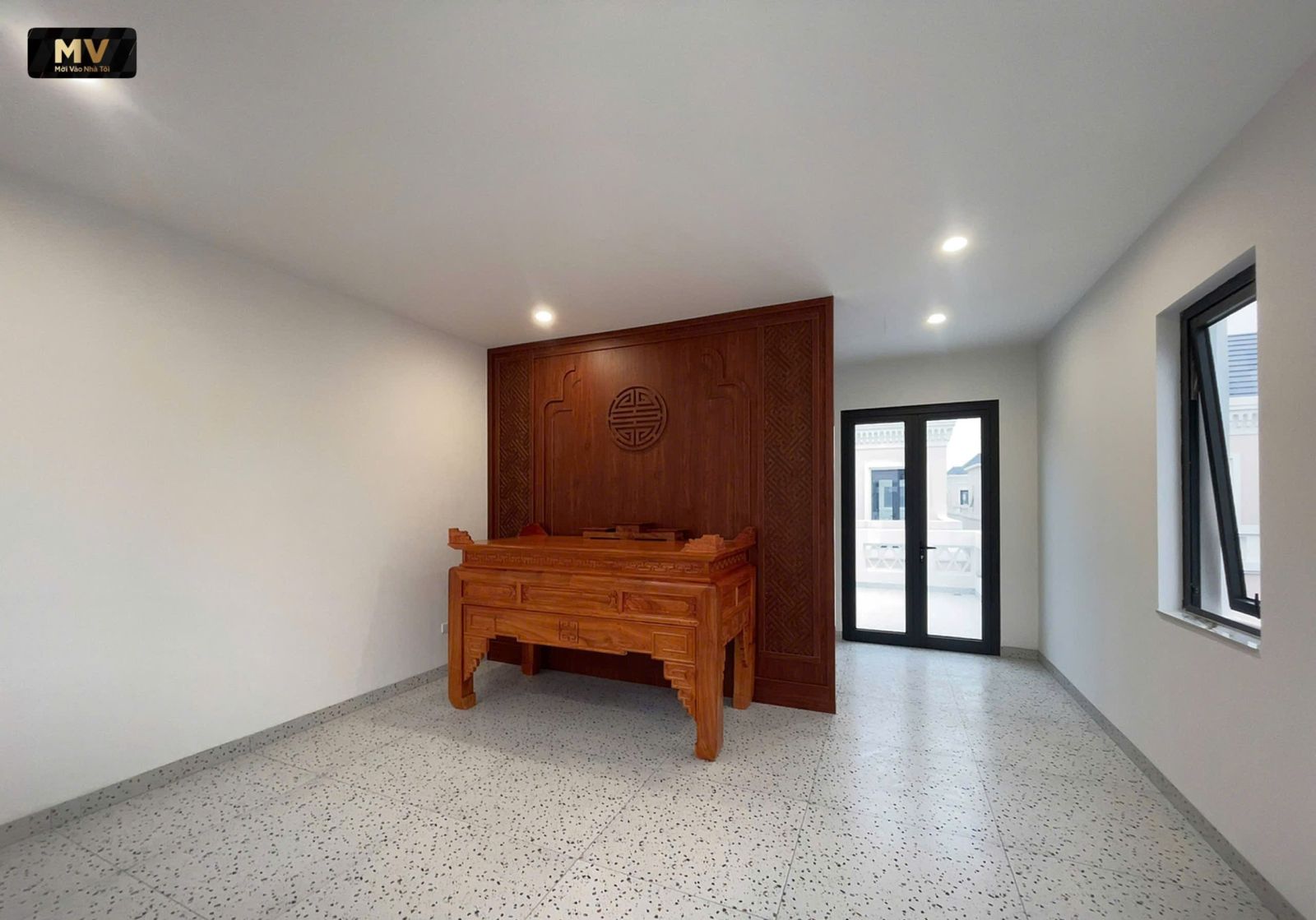 Phòng thờ có mảng gỗ lớn làm điểm tựa thị giác, bố cục cân đối, ánh sáng vừa đủ. Đây là kiểu thiết kế ít nhưng chuẩn.