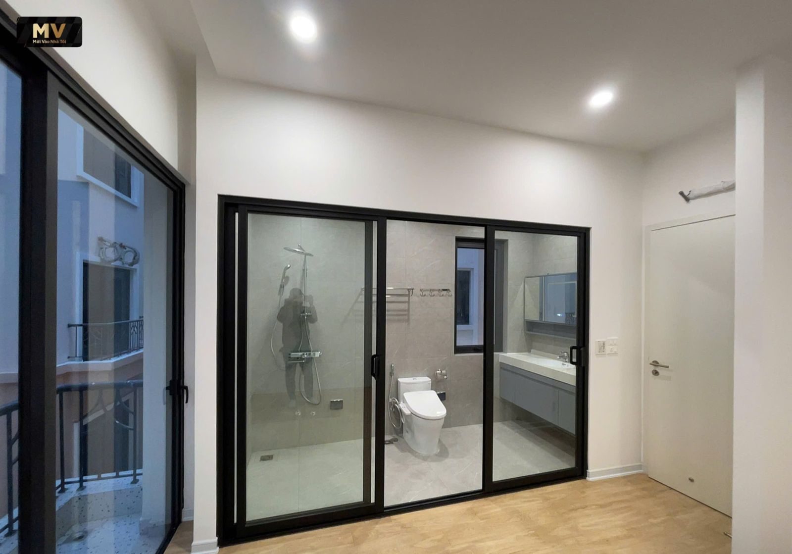 - mảng kính khung đen tạo cảm giác “suite khách sạn” mạnh