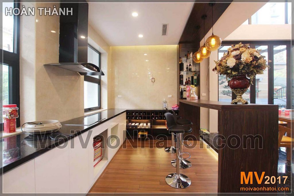 Phòng ăn được nâng cốt sàn và có các đèn khe hắt giúp tạo cảm giác thay đổi không gian, đồng thời khu vực ăn uống được đặt ở khu giếng trời, với hệ đèn chùm thả xuyên suốt từ trên xuống kết hợp các đèn rọi Led tập trung vào khu bàn ăn mang cảm giác cho người dùng như đang ở trong nhà hàng 5 sao . Phòng ăn ngăn cách với không gian bếp bằng một quầy bar sử dụng gỗ HDF màu trầm hợp lý về công năng đảm bảo thêm sự liên kết gần gũi. Mảng tường phòng bếp được ốp bằng đá granite trắng vân lớn mang lại sự sang trọng cho phòng bếp.