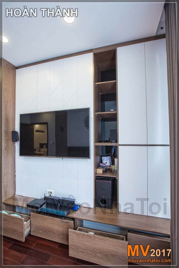 Nếu chỉ nhìn hình ảnh hoàn thiện này, các bạn sẽ chưa hiểu hết ngay vẻ đẹp đằng sau của nó. Thực tế căn hộ chung cư Royal City trước khi thiết kế thi công nội thất, đây là 1 mảng tường rất lồi lõm nhiều góc cạnh, phía sau vách TV là cột bê tông, và bên cạnh đó là 1 khoảng lõm, nhưng sau khi được các KTS MV xử lý, chúng lại trở nên đồng phẳng, ăn nhập và rất đẹp, như thể các góc cạnh đó chưa từng tồn tại.