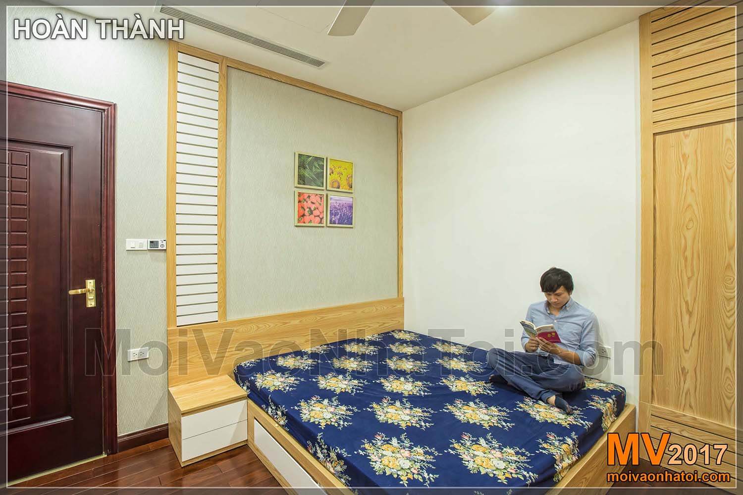 Phòng ngủ con được thiết kế với tông màu gỗ sáng phong cách, không giống với các căn phòng khác trong căn hộ. Tường phòng ngủ con cũng được sử dụng giấy dán tường Hàn Quốc chất lượng tốt. Với không gian như này thì bé sẽ yên tâm học hành & giải trí…