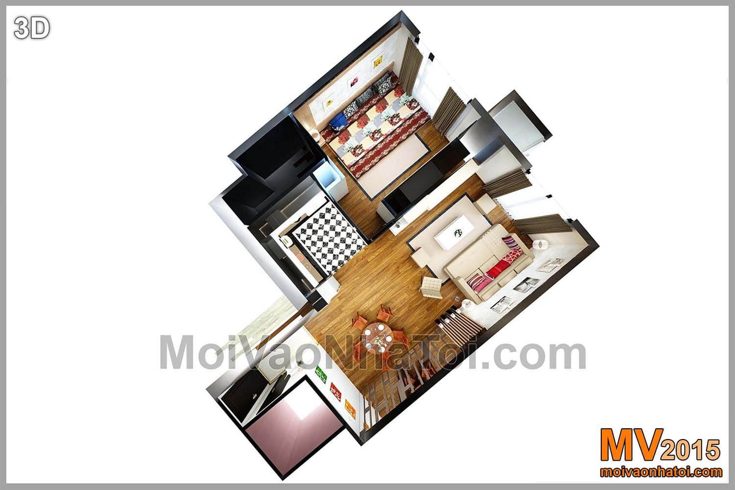 3D mặt bằng thiết kế chung cư T8 Times City 82m2 sau khi chuyển đổi từ 2 phòng ngủ thành 1 phòng ngủ: