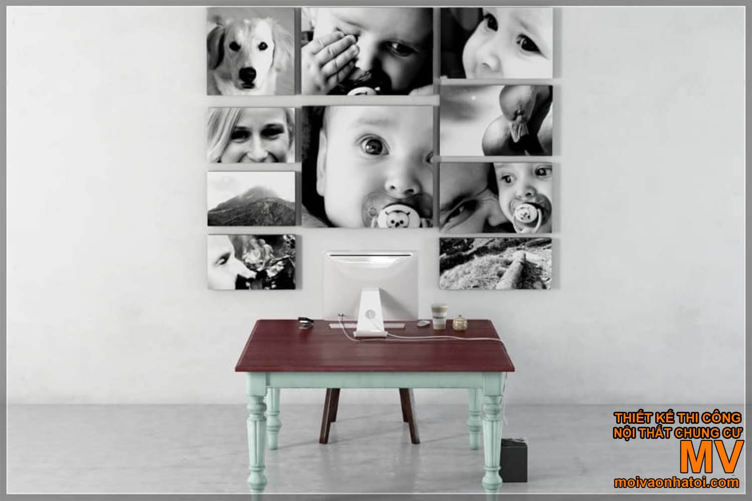 Góc làm việc decor rất đơn giản nhưng không hề gây ra sự đơn điệu. Chiếc bàn làm việc với mặt bàn bằng gỗ mộc màu nâu đỏ, phần chân bàn màu xanh, với những hoa văn chạm khắc giống chi tiết những thanh chắn lan can cầu thang. Mảng tường phía sau được trang trí rất nhiều hình ảnh trẻ em, thể hiện chủ nhân là một người rất yêu thích trẻ con.