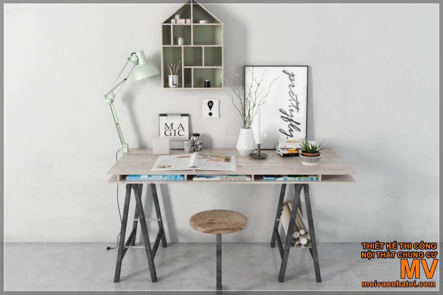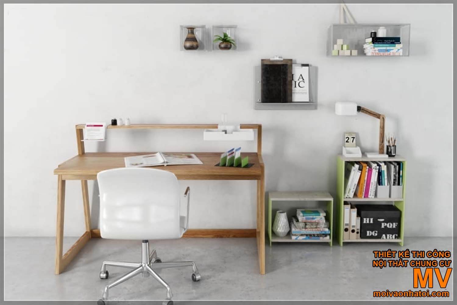 Không gian góc làm việc trông rất đơn giản nhưng vãn mang tính thẩm mỹ. Chiếc bàn làm hoàn toàn bằng gỗ tự nhiên,có một thanh gỗ được bắc lên để giúp bạn có thể treo những vật dụng cần thiết. Ghế xoay có phần chân bằng inox, phần tựa bằng nhựa acrylic. Bên cạnh trang trí thêm những kệ sách nhỏ tạo điểm thu hút cho góc làm việc.