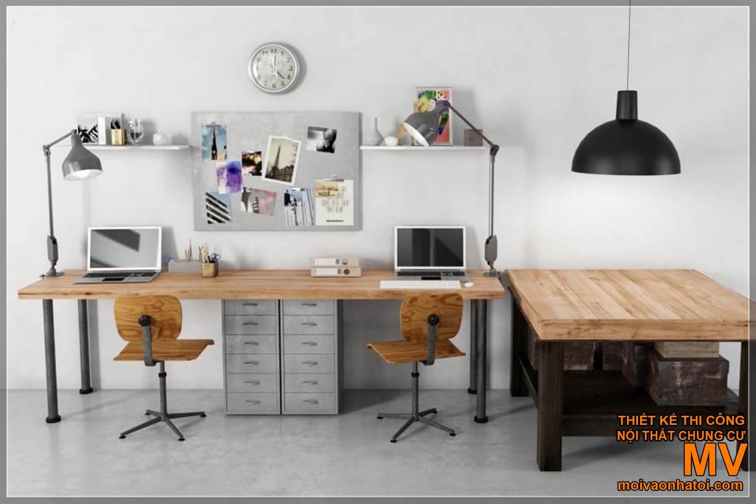 Gỗ tự nhiên luôn được ưu ái trong việc ứng dụng vào trang trí nội thất bởi nhiều tính năng ưu việt. Không gian bàn làm việc với mặt bàn bằng gõ, chân là những thanh sắt trụ tròn chắc chắn,những chiếc ghế xoay với thiết kế cũng bằng gỗ,phần chân bằng sắt giống với chân bàn. Bên cạnh còn có thêm một chiếc bàn gỗ, có thể ngồi trò chuyện, giao lưu sau những giờ làm việc căng thẳng.