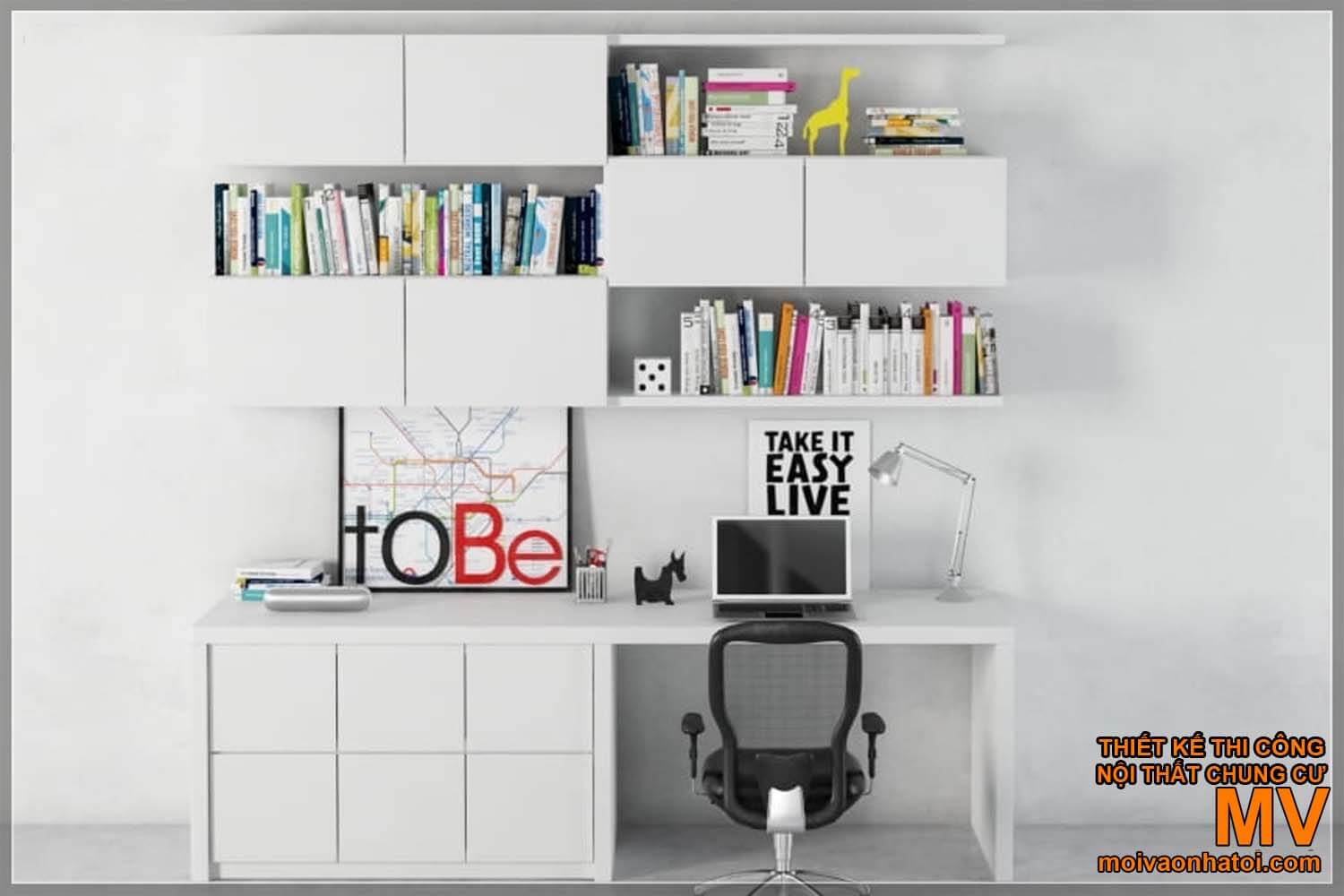 ,hiện đại. Bàn làm việc được tính hợp cùng với tủ đựng đồ và giá sách mang chất liệu nhựa acrylic.