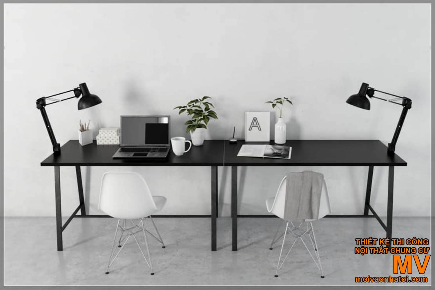 Bàn làm việc được thiết kế với kiểu dáng đơn giản, chỉ là chiếc bàn hình chữ nhật màu đen được ghép lại với nhau nhưng trên nền màu trắng của bức tường thì rất nổi bật. Ghế ngồi làm bằng nhựa, chân là những thanh inox xen kẽ, liê kết với nhau.