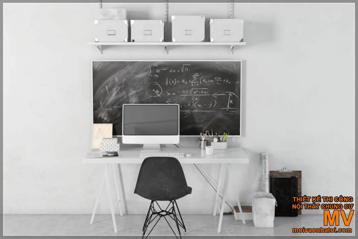 Cũng là thiết kế bàn làm bằng nhựa acrylic sáng trắng nhưng kết hợp với ghế ngồi màu đen cùng với một chiếc bảng đen lớn được trang trí trên tường, tạo nên sự hài hòa thống nhất.