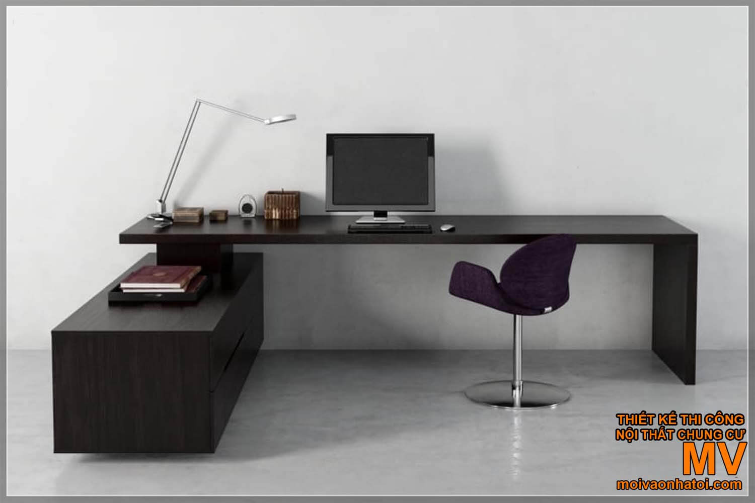Góc làm việc được thiết kế rất đơn giản với chiếc bàn gỗ màu đen, một bên gấp khúc vuông góc tạo thành chân bàn, một bên là tủ đồ vừa có tác dụng chứa tài liệu,đồ dùng,vừa có tác dụng nâng đỡ bàn làm việc.