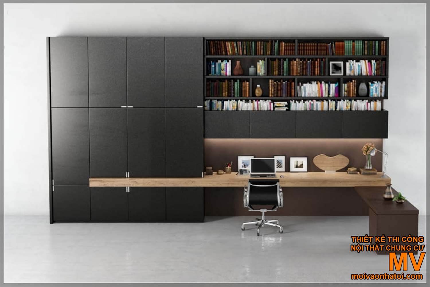 Thiết kế góc làm việc vô cùng độc đáo với bàn làm việc dài bằng gỗ màu nâu vàng, đâm xuyên vào không gian chiếc tủ đồ màu đen cũng bằng gỗ. Tạo điểm mới lạ, khác biệt. Thiết kế giá sách gắn liền luôn với chiếc tủ tạo nên sự gắn kết đồng đều cho không gian.