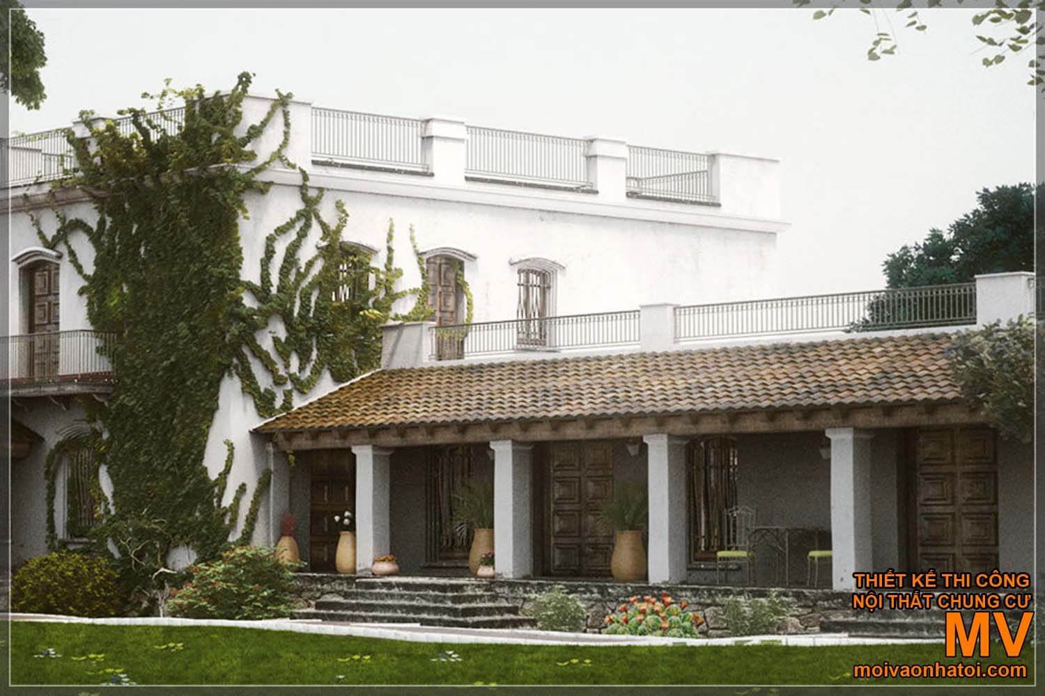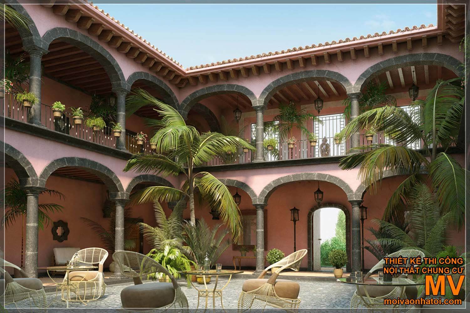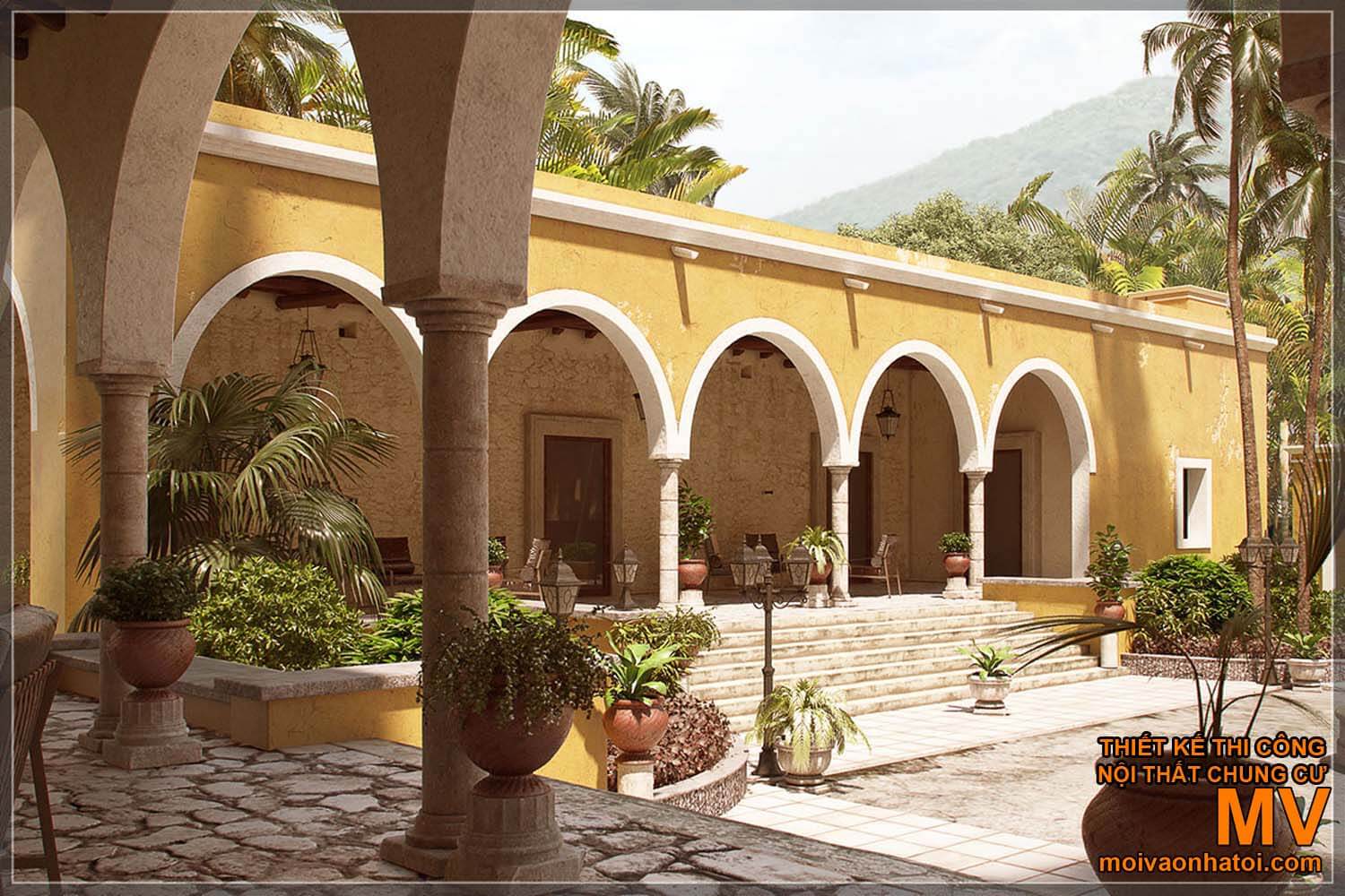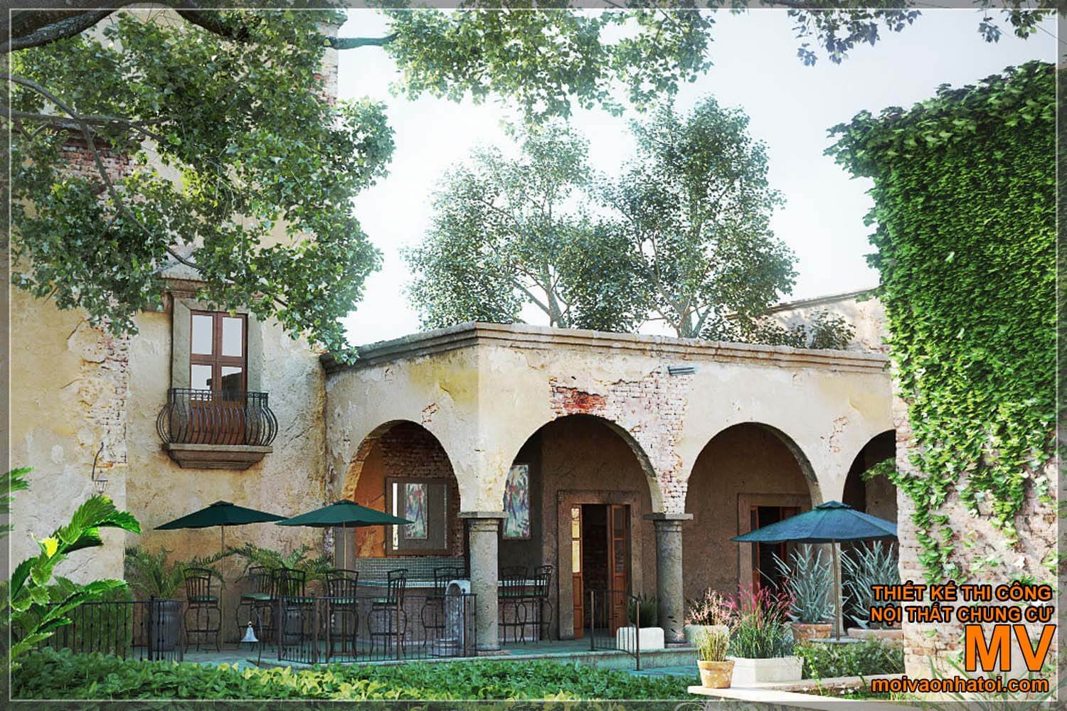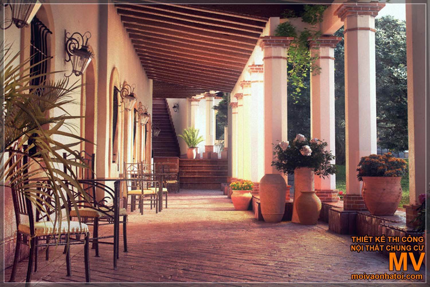 Vẫn là hình ảnh mái vòm nổi bật, Nhà Địa Trung Hải còn đầu tư mạnh tay cho thiết kế hiên nhà và không gian ngoài trời. Với khí hậu ôn hòa, nắng ấm quanh năm, sinh hoạt ngoài trời là phần không thể thiếu trong mỗi gia đình Nam Âu. Đôi khi, chỉ đơn giản là 1 bộ bàn ghế mây cùng cây xanh nhỏ cũng tạo nên 1 nơi nghỉ ngơi lý tưởng của gia đình.