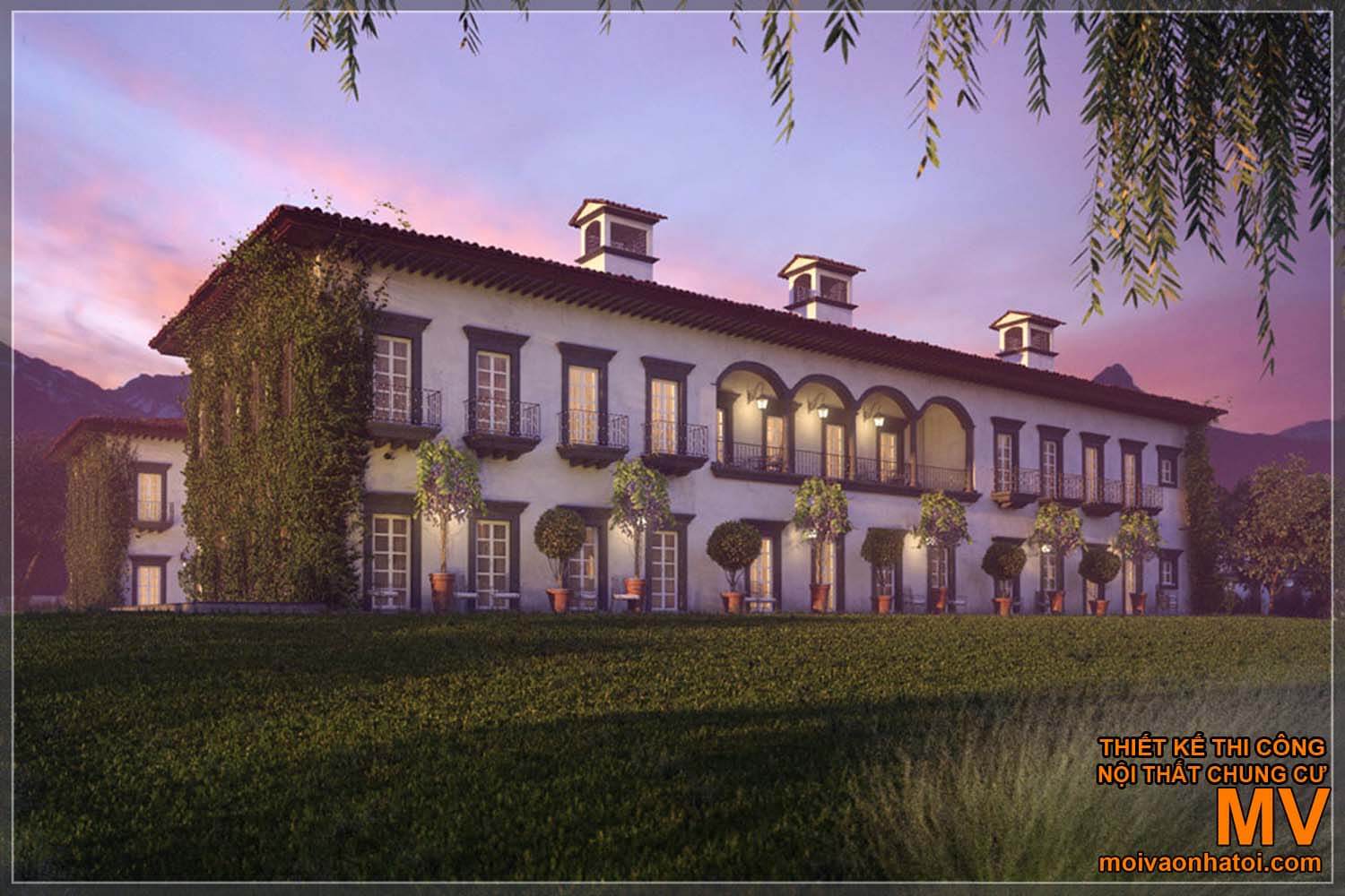 Một căn biệt thự Địa Trung Hải rất rộng lớn được xây dựng trên một thảm cỏ xanh ngát, với những mái ngói vòm thủ công cao rộng, những veranda (hành lang) chạy dài bao bọc lấy hàng hiên mang nét hoài cổ đầy kiêu sa. Việc bố trí hệ thống rất nhiều cửa sổ giúp đón trọn ánh sáng tự nhiên từ bên ngoài vào, tiết kiệm được một lượng lớn điện năng. MẢng tường được bao phủ bởi dàn cây leo ngăn ánh sáng trực tiếp chiếu vào căn nhà, khiến căn nhà mát mẻ hơn.