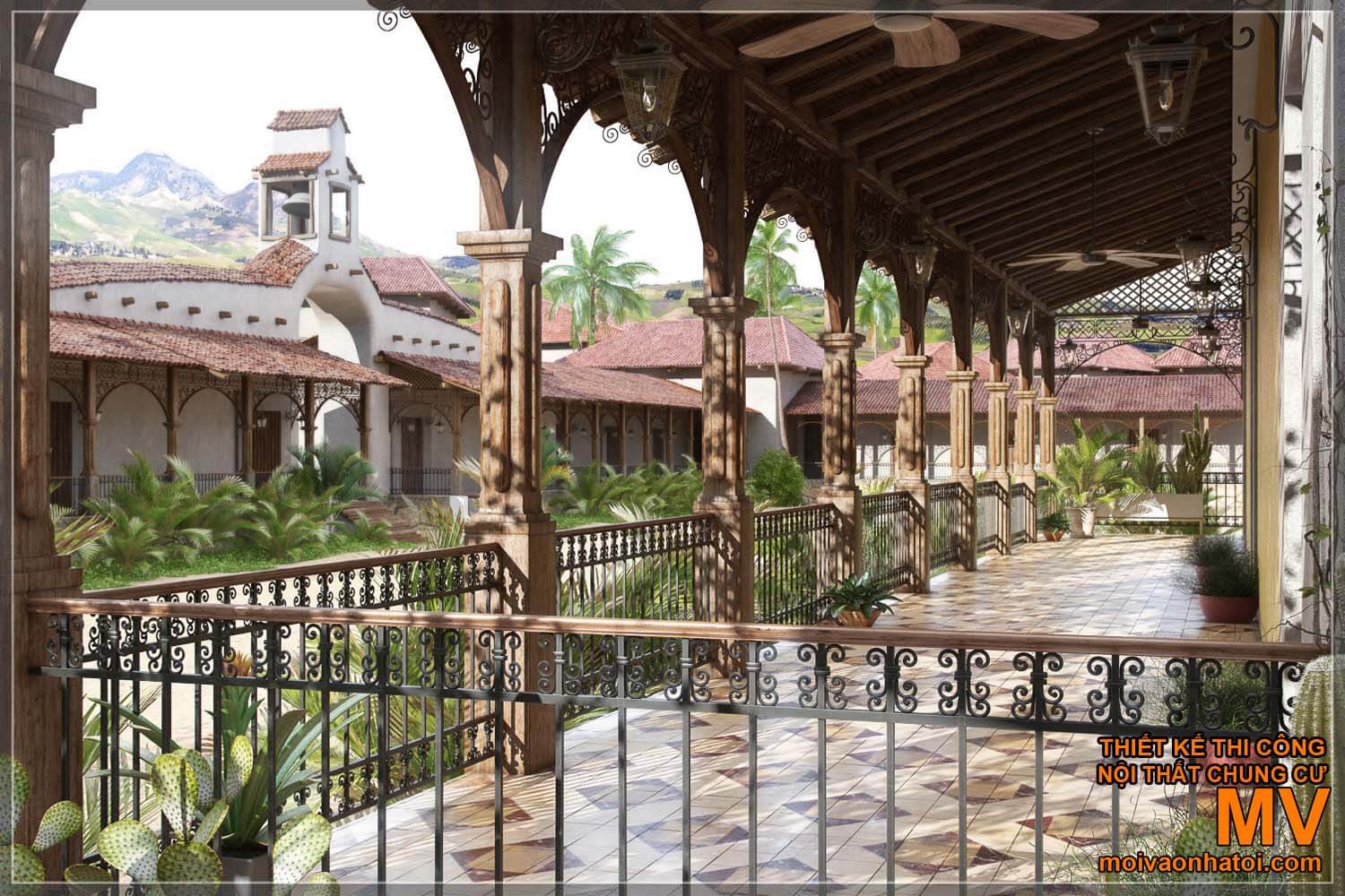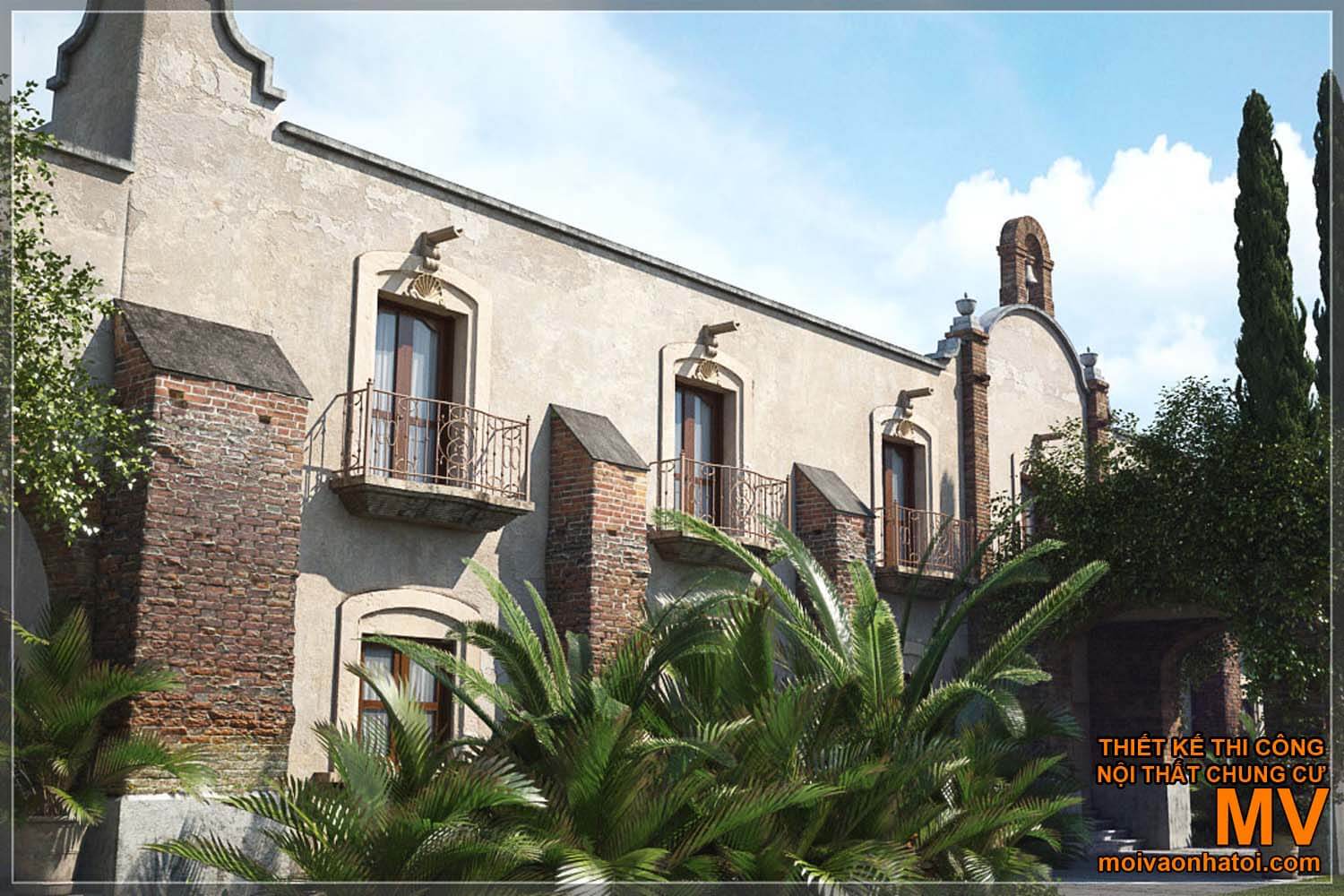 Không gian ngoại thất của một nhà thờ mang phong cách kiến trúc Địa Trung Hải, với điểm nổi bật là phần thiết kế nhô ra được xây dựng bằng gạch thô, mang đến cảm giác mộc mạc, gần gũi. Nét quen thuộc là chi tiết hình mái vòm-đặc trưng quan trọng của kiến trúc địa Trung Hải. BƯớc ra ngoài cánh cửa là không gian ban công, giúp bạn có thể ngắm nhìn khung cảnh bên ngoài, cùng với một hệ thống lớn các cây xanh mang lại cho bạn cảm giác yên bình hơn rất nhiều.