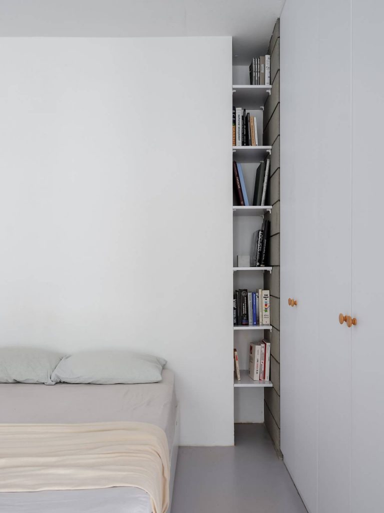 Bên trong, phòng ngủ cũng có nội thất mang đậm phong cách tối giản với tông màu trắng sáng bao chùm. Không gian nhỏ có chiếc giường ngủ không đầu làm bằng gỗ trắng.