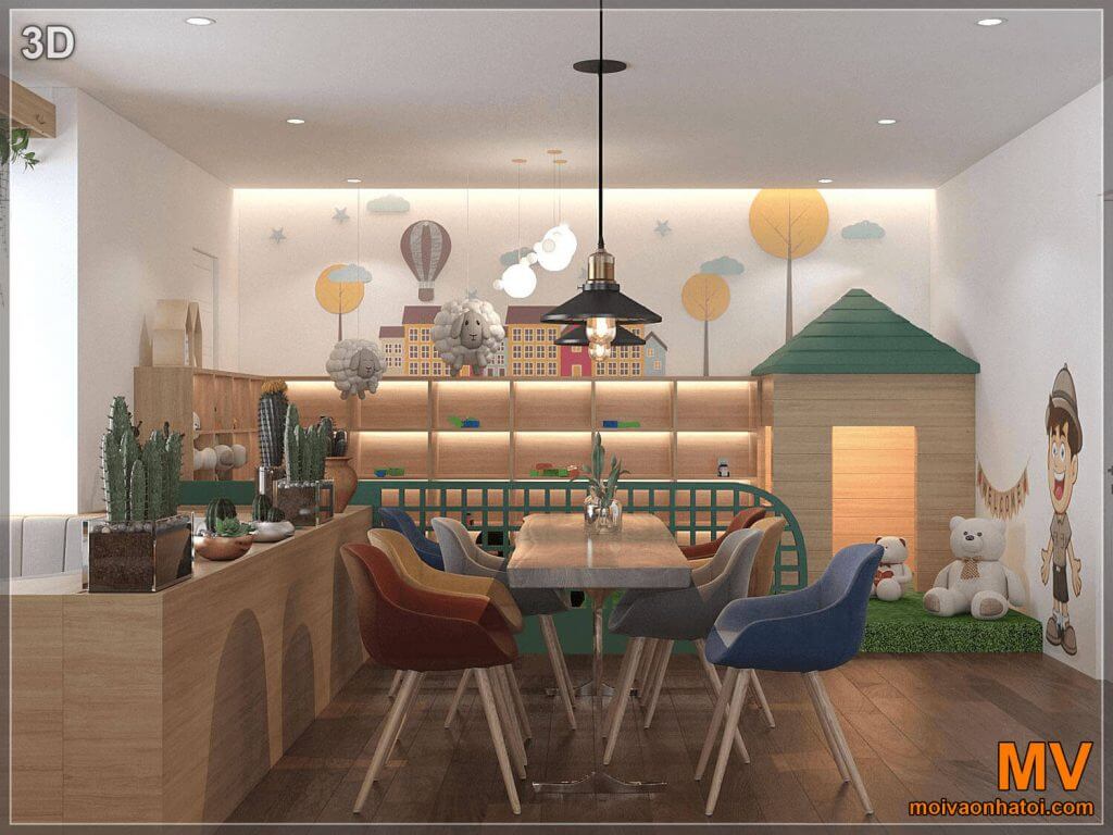 Hiểu được tâm lý của bậc phụ huynh e ngại khi mang theo con nhỏ, MV thiết kế góc dành riêng cho trẻ nhỏ, để các bậc làm cha mẹ có thể yên tâm làm việc riêng của mình mà không phải lo sợ cho con. Màu sắc thiết kế bắt mắt và phù hợp với lứa tuổi của các con nhưng vẫn phù hợp với phong cách chung của quán.