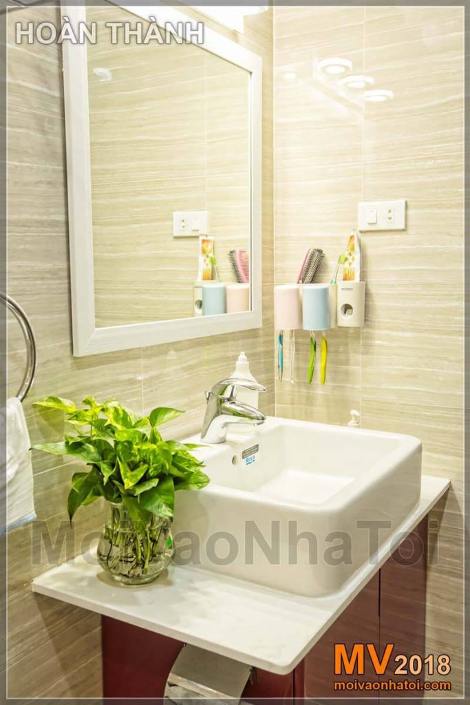 Phòng vệ sinh chung được thiết kế đơn giản . Bố trí lọ cây trong phòng vệ sinh tạo không khí sạch sẽ và mang lại vẻ đẹp như trong các khách sạn cao cấp.